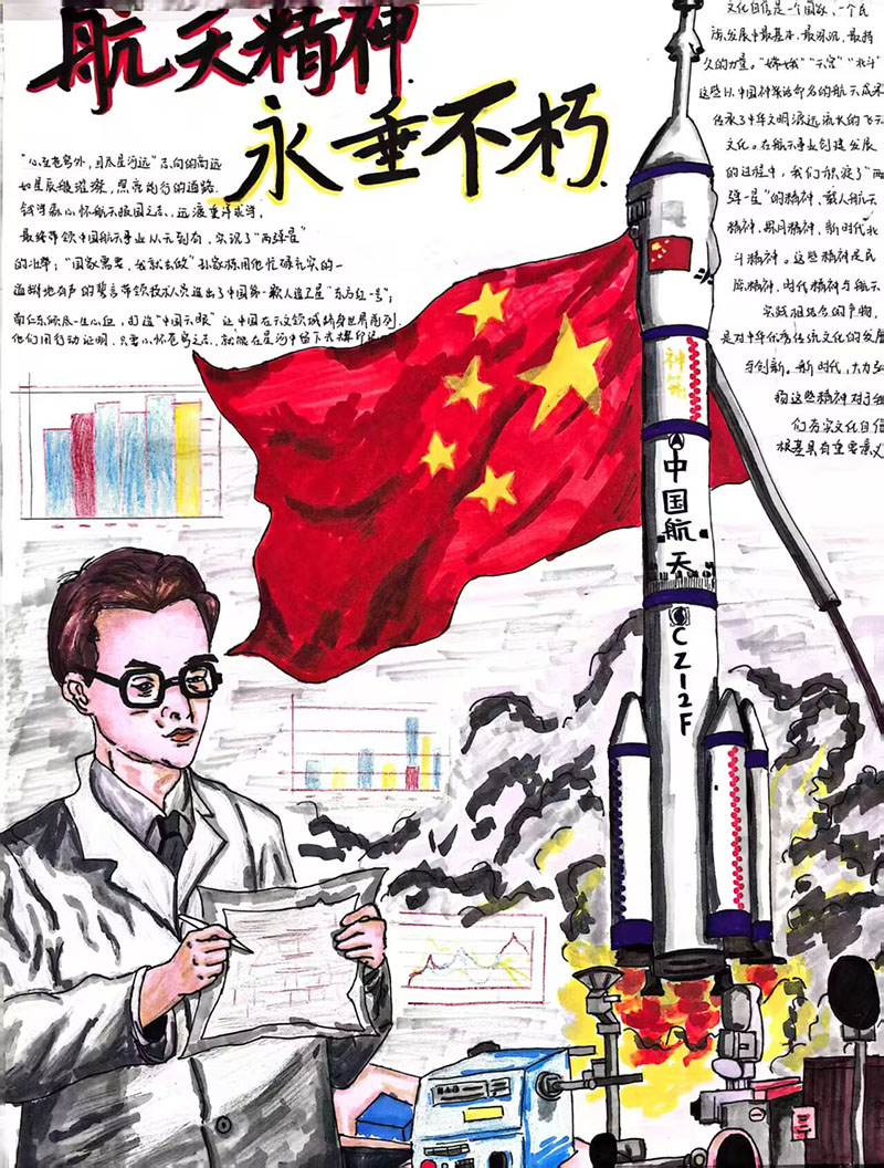 为厚植学生家国情怀,传承和弘扬航天精神,近日,我校高一年级精心组织了“我心中的航天精神”手抄报创作活动,高一学子踊跃参与,用笔墨勾勒航天梦想,以创意诠释航天精神。