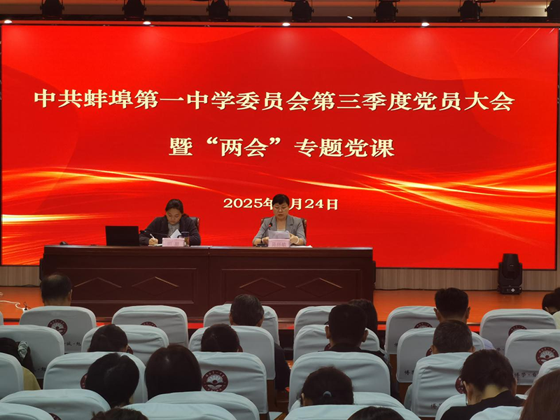 924日,中共蚌埠第一中学委员会第三季度党员大会暨 “全国两会” 专题党课在综合楼四楼报告厅隆重召开。蚌埠一中党委副书记、校长田甜,党委委员、副校长陈怀敏及全体党员参加会议,会议由田甜同志主持。