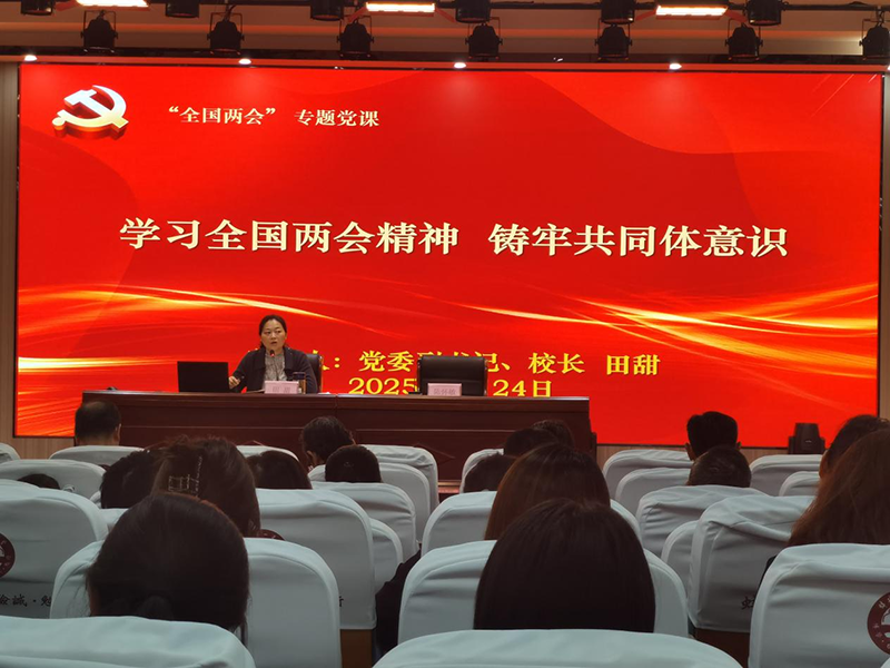 学习环节结束后,田甜同志以“学习全国两会精神 铸牢共同体意识”为题讲授专题党课。她首先介绍了2025年全国两会的基本概况,指出此次两会作为全面贯彻党的二十届三中全会精神的关键会议,对“十四五”规划收官具有重要意义。随后,田甜同志从“稳中有进的发展成就”“清晰明确的政策取向”“重点突出的工作任务”三个维度解读政府工作报告。党课最后,田甜同志结合学校实际提出要求,希望全体党员将两会精神与教育家精神、抗战精神相融合,把学习成果转化为教育教学工作的动力,在各自岗位上踔厉奋发,为培养德智体美劳全面发展的社会主义建设者和接班人、推动学校高质量发展贡献党员力量。